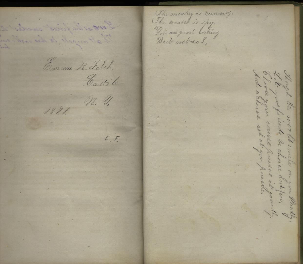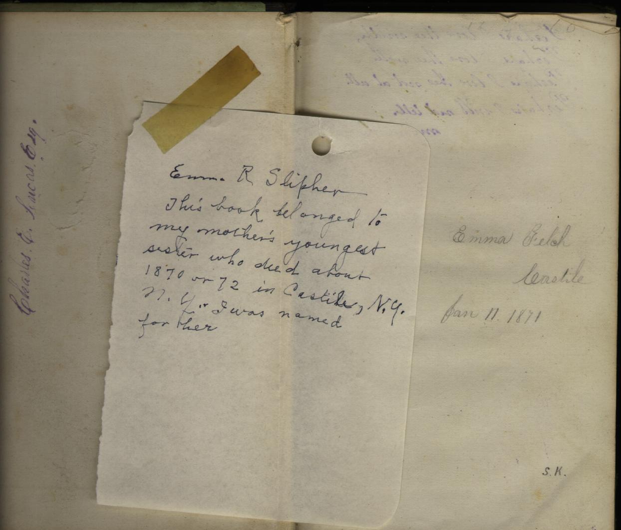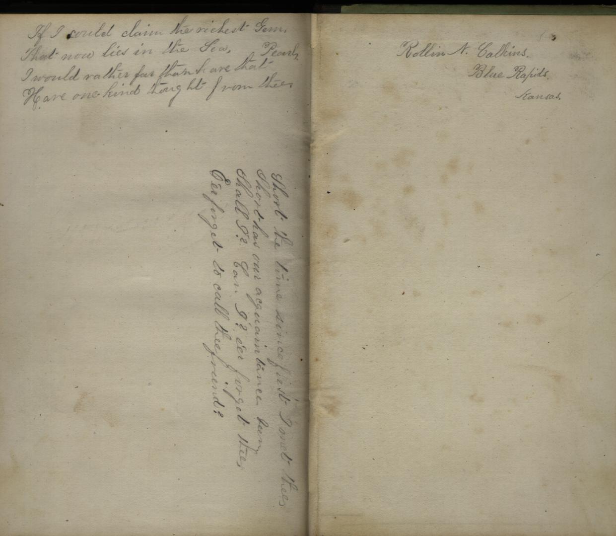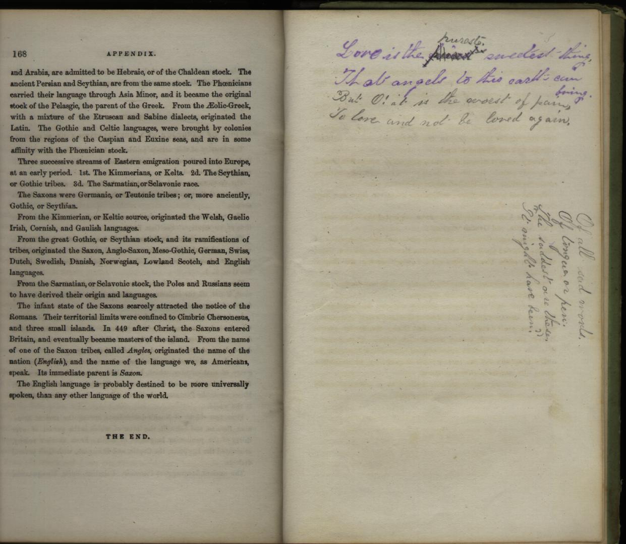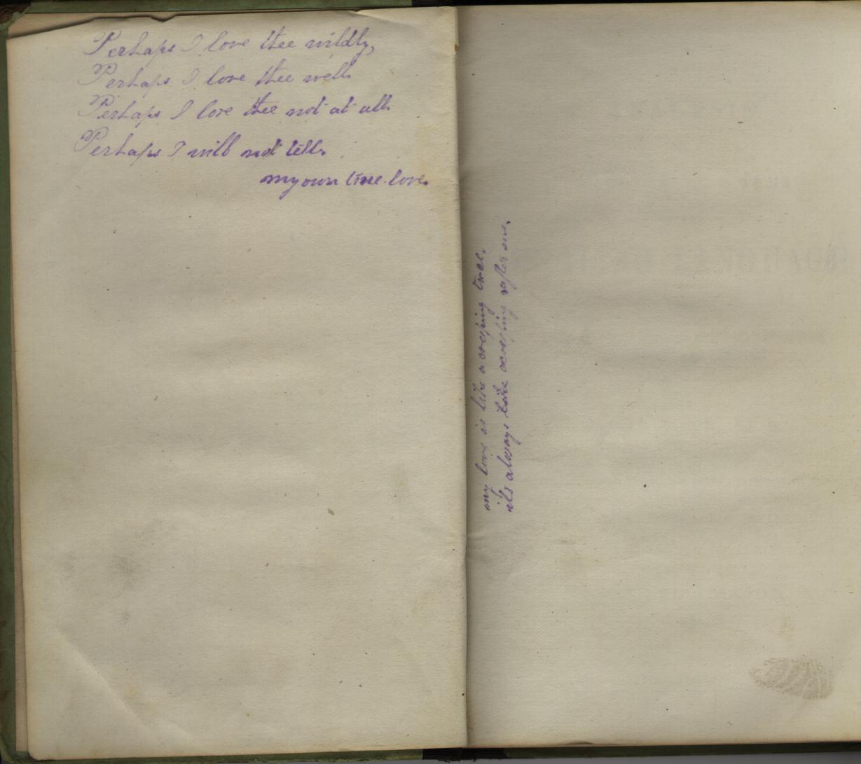 I suspect this was prompted by some old books I was looking through last night. I inherited them from an old man my mom used to work for, who died a couple years ago and his family was trying to get rid of all his stuff so they could sell the house. Several of the books are apparently college engineering texts from around the turn of the century (copyrights in the late 1800's) but one of them is Town's Analysis of Derivative Words and has several love poems written in various places on the inside covers. Maybe those were autographs by friends of the lady to whom the book belonged. I'm not sure.